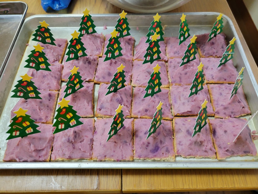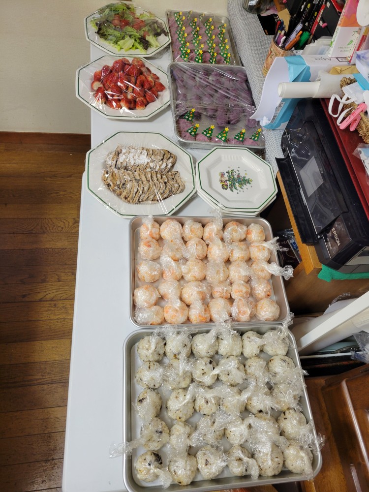 せたべるさん経由で頂いたポテトフライや紫芋も使わせてもらい、ブッフェ形式のパーティーでした。赤ちゃんから中学生までのお子さまやご家族も一緒に会食、クリスマスプレゼントをもらったり、本を読んでもらったり遊んだりして楽しい時間を過ごしました。